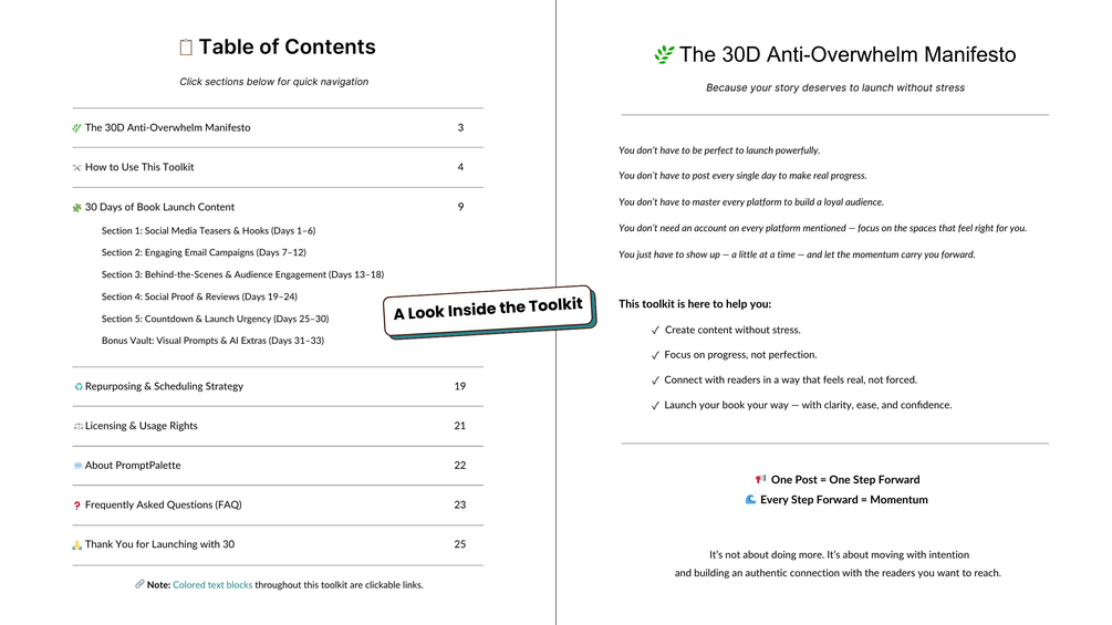 • 30 ready-to-use book launch prompts, designed to build real reader engagement