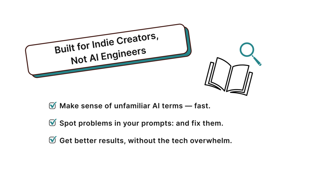 Built for indie creators, writers, and digital entrepreneurs, this clear, practical guide explains the most common AI terms, including prompts, tokens, temperature, and more.